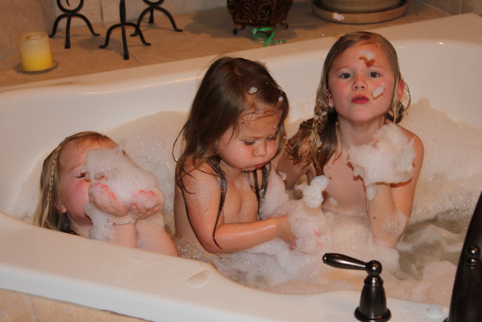 When the girls arrived, they were all wet and cold from playing in the snow. I suggested putting them all in the tub before we ate so they could get warm. So I ran the jacuzzi and they were so happy to have bubbles and warm!